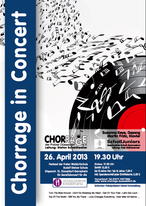 Ein Umzug ist immer aufregend. In diesem Fall war es für uns besonders spannend. Klappt alles am neuen Ort, folgt uns unser Publikum und wie gefällt es allen? Wir vom Chor sind begeistert vom neuen Veranstaltungsort, der uns viele neue Möglichkeiten bietet. Nicht nur, das er Platz für mehr Publikum hat, auch haben wir eine echte Bühne mit mehr Bewegungsfreiheit und haben so die Möglichkeit den Chor auch noch zu vergrößern. Eine kreative Beleuchtungstechnik setzte den Chor und seine Gäste stets ins rechte Licht. Frühlingskonzert, d.h. bei Chorrage flotte Musik vom Chor, der Solistin Susanna Keye, unseren Musikern Martin Fratz am Klavier, Alexander Teschner an der Gitarre, David Mirche am E-Bass, Markus Meisner am Schlagzeug , sowie unseren jungen Gästen, den SchollJuniors. Wir eröffneten das Konzert mit „Turn the Beat Around“ bei dem Musiker und Chor voll aus sich herauskamen. Der Saal und das Publikum war von uns Chorrage/isten schnell in Beschlag genommen. Nach der Begrüßung durch unsere 1.Vorsitzende Heike Lammersen wurde es etwas ruhiger, denn „Love Changes Everything“ aus dem Musical Aspects of Love von Andrew Lloyd Webber sollte ja seine Wirkung zeigen.Mit Susanna Keye konnten wir eine Solistin gewinnen, die es verstand mit ihrer jazzigen Stimme sich ganz auf unseren Gesangsstil einzulassen. Sowohl mit ihren Soloeinlagen als auch die Übernahme der solistischen Parts des Chores gelang es ihr das Publikum in ihren Bann zu ziehen. Ein eigens von ihr für dieses Konzert geschriebene Stück unter der sehr einfühlsamen Klavierbegleitung von Stefan Scheidtweiler, verzauberte das Publikum und ließ sich teilweise zum Träumen verleiten.