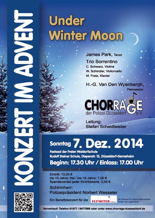 'Under Winter Moon', eine musikalische Reise in die Weihnachtswelt Am 7. Dezember war es wieder soweit, das Weihnachtskonzert von Chorrage der Polizei Düsseldorf unter der musikalischen Leitung von Stefan Scheidtweiler fand in dem voll besetzten Festsaal der Waldorfschule in Gerresheim statt. Der diesjährige wunderbare Konzertabend stand unter dem Motto des winterlichen Mondes und tatsächlich schien an diesem Abend auch der Vollmond, allerdings gut versteckt unter einer dicken Wolkenschicht. Sogar Polizisten aus den Niederlanden gehörten zu den Gästen und wurden durch die Kollegin und Chorsängerin Marion H. herzlich begrüßt. Bereits seit dem Sommer hatten sich die Sängerinnen und Sänger des Chores zu wöchentlichen Proben getroffen. Unterstützt wurden sie bei diesem Konzert von vier weiteren professionellen Musikern einer Live-Band. Der Spendenanteil des Konzertes ging diesmal an die ELFMETERstiftung, welche sich für Kinder und Jugendliche mit Rückenmarksverletzung einsetzt.Das Konzert nahm die Besucher mit auf eine winterliche Reise quer durch die Musik verschiedener Zeiten und Länder. Knapp zwei Stunden lang wurden weihnachtliche Highlights der Musik dargeboten, von Werken Händels bis hin zu den bekannten amerikanischen Weihnachtssongs. Die Atmosphäre während des Konzertes wechselte zwischen Andächtigkeit, Behaglichkeit und Freude, auch die Sehnsucht nach Harmonie erfüllte den Raum.